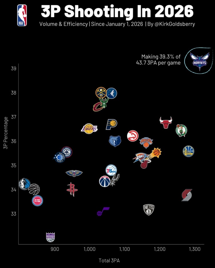 横轴-三分总出手数;纵轴-三分命中率;黄蜂场均出手43.7次&命中率为39.3%
