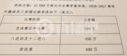 2025-26赛季,外援工资帽总共为425万美元。但2026-27赛季,外援工资帽很有可能根据球队晋级的阶段从而逐渐提升。如果球队打到总决赛的话,那么外援工资帽有望达到500万美元。