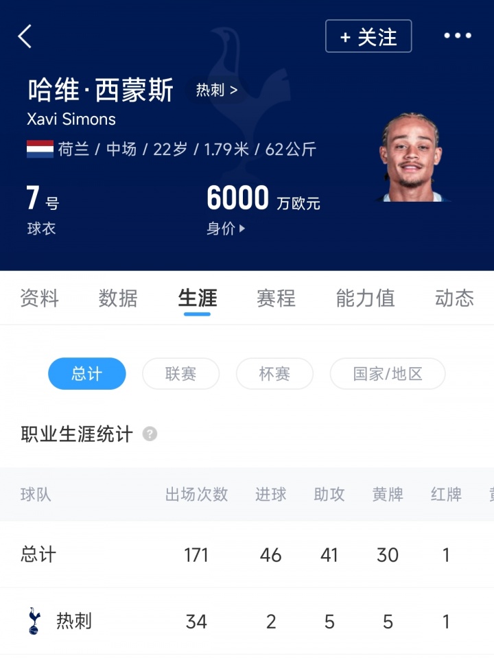 去年夏窗热刺花费6500万欧元的转会费,从RB莱比锡签下22岁的哈维·西蒙斯,他也由此成为了热刺队史标王。本赛季西蒙斯为热刺出战34场,贡献2球5助,表现不尽人意。