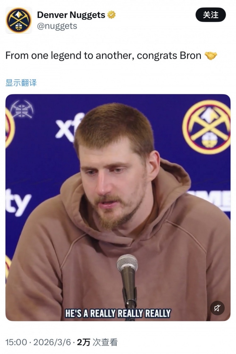 赛后,掘金官推转发了约基奇称赞詹姆斯的言论,并写道:“一位传奇对另一位传奇的致敬,祝贺勒布朗?”