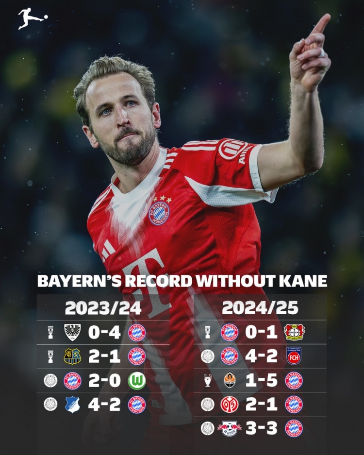 德甲官方统计了过去两个赛季凯恩缺席情况下拜仁的战绩,2023-2024赛季2胜2负,2024-2025赛季2胜1平2负。