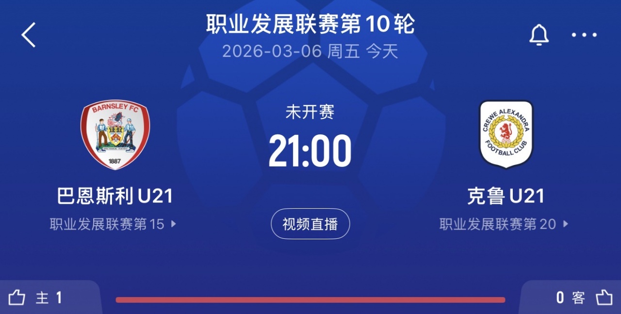本场比赛21点开球,巴恩斯利目前排名第15,本场对手排名联赛垫底。